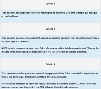 En total, Salud determinó cuatro criterios para definir su una persona debe ser testeada. El primero es para todo aquel que tenga tos, dolor de garganta, dificultad para respirar y pérdida de olfato y gusto. El segundo criterio contempla a “todo paciente con diagnóstico clínico y radiológico de neumonía y sin otra etiología que explique el cuadro clínico”. El tercero abarca a los pacientes con pérdida del olfato y gusto. El cuarto es para el personal de la salud: si presentan fiebre o al menos dos de los demás síntomas serán testeados.