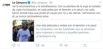 En su perfil de Twitter se definía así: “Militante. La salud es un derecho. NO una mercancía”.