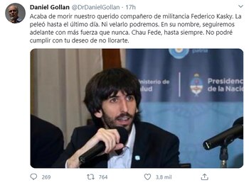 A través de sus redes sociales, importantes funcionarios que lo tuvieron como compañero de militancia y de trabajo destacaron su figura y su profesionalismo. Así, el presidente Alberto Fernández destacó una vez más su “inmenso compromiso con la salud pública”. Volnovich expresó su “infinito dolor” por la pérdida. También con pocas pero profundas palabras lamentó su fallecimiento el ministro de Salud bonaerense Gollán. Incluso el propio gobernador Axel KIcillof le dedicó unas sentidas palabras.