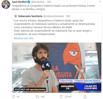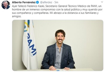 Antes que su último tuit, Kaski posteó el lanzamiento del programa de medicamentos esenciales gratuitos del PAMI que realizó Alberto Fernández, junto a Volnovich, el ministro de Interior, Eduardo"Wado" de Pedro, y la intendenta de Quilmes, Mayra Mendoza. En la foto de ese acto, se lo ve a Kaski en un segundo plano, justamente detrás de Mendoza y De Pedro. Fue la última aparición pública de Kaski, que según la información de la obra social de los jubilados y pensionados estaba enfermo de cáncer.