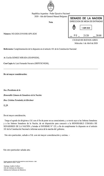 El primero de abril, exactamente un mes después de la Asamblea Legislativa en la que el presidente Alberto Fernández protagonizó su primera apertura de sesiones ordinarias, el jefe de Gabinete Santiago Cafiero envió una nota al Senado de la Nación. En la misiva se puso a disposición de esa cámara para brindar su informe en el marco de lo que establece el artículo 101 de la Constitución.