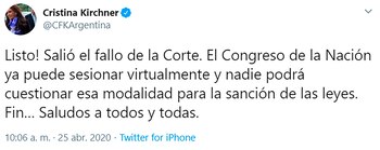 Esta mañana escribió un tuit: “Listo! Salió el fallo de la Corte. El Congreso de la Nación ya puede sesionar virtualmente y nadie podrá cuestionar esa modalidad para la sanción de las leyes. Fin… Saludos a todos y todas”.