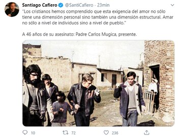 Alicia Kirchner, por su parte, aseguró que al padre Mugica “le quitaron la vida pero no su ejemplo. Recordémoslo por su entrega, por la defensa de los derechos sociales, por su trabajo por los que más necesitan”, dijo. “Siempre estuvo junto a los más vulnerables”, escribió el secretario general de la Presidencia, Julio Vitobello.
