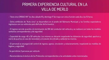 Por otra parte, el gobernador también resaltó que regresarán las funciones del auto-circo en la ciudad de Merlo: en principio, serán dos únicas presentaciones que se realizarán este sábado y domingo a las 15:00, en el predio del Balneario Municipal, con un máximo de hasta tres personas por vehículo.