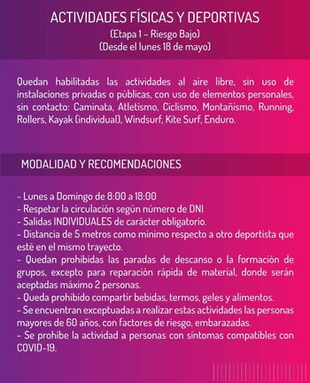 Desde el lunes próximo comenzará la “fase 1” para los deportes al aire libre, estos son aquellos que impliquen riesgo sanitario bajo, se puedan realizar sin necesidad de instalaciones privadas o públicas, con uso de elementos personales y sin contacto, como caminata, running, senderismo, atletismo, ciclismo y pesca individual, entre otros. Estas actividades se podrán realizar todos los días, de 8:00 a 18:00 y respetando la circulación según número de DNI.