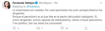 “El otro día les comentaba la anécdota de Roosevelt con los gremialistas que, en una reunión, le estaban exigiendo reivindicaciones laborales. Al final, Roosevelt se levanta y les dice: ‘Está bien. Estoy de acuerdo con esas medidas. Ahora salgan a la calle y oblíguenme a tomarlas’", escribió Vallejos en un tuit.