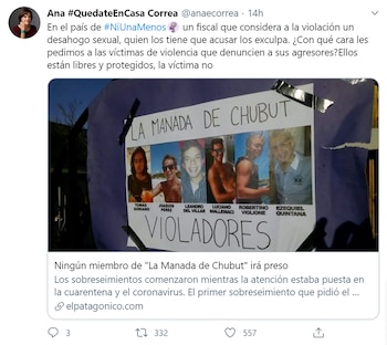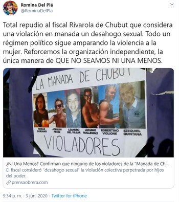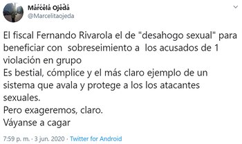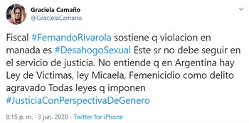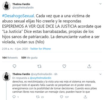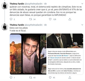 Mientras que los hashtags #DesahogoSexual y #ViolaciónEnManada escalaban en Twitter, también referentes de distintos espacios sociales repudiaron la actitud del fiscal de la ciudad chubutense de Rawson. Una de ella fue Thelma Fardín, y lo calificó de “energúmeno”.
