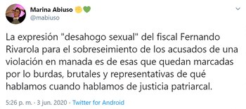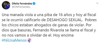 En sus redes sociales también se refirió al caso la legisladora porteña del Frente de Todos, Ofelia Fernández. “Una manada viola a una piba de 16 años y hoy al fiscal se le ocurrió calificarlo de desahogo sexual. Pobres los chicos, estaban ahogados de ganas de violar. Por dios que basuras, Fernando Rivarola se llama el fiscal y no nos vamos a olvidar de el”, enfatizó Fernández.