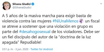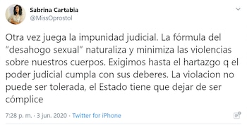 Por su lado, la titular del PRO, Patricia Bullrich, apuntó: “Tan brutal como la expresión ‘desahogo sexual’ que expresó el Fiscal para explicar una violación en manada, es la figura del juicio abreviado. Los acusados aceptan su culpa y se van con la pena mínima. No puede haber juicio abreviado para delitos graves. No es justicia!!!”.