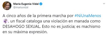Además de las declaraciones de los referentes del Frente de Todos, las críticas al fiscal también llegaron por parte de la oposición. Por caso, la ex gobernadora de la provincia de Buenos Aires, María Eugenia Vidal, calificó el accionar del fiscal como “machismo en su máxima expresión”. La dirigente de Juntos por el Cambio expresó en su cuenta de Twitter: “A cinco años de la primera marcha por #NiUnaMenos, un fiscal cataloga una violación en manada como desahogo sexual. Esto no es justicia; es machismo en su máxima expresión”.