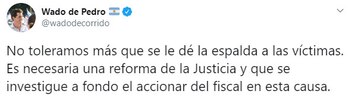 Por su parte, el ministro del Interior, Eduardo “Wado” de Pedro manifestó en su cuenta de Twitter, la necesidad de “una reforma de la Justicia” y pidió que “se investigue a fondo el accionar del fiscal en esta causa”. “No toleramos más que se le dé la espalda a las víctimas”, agregó el funcionario.