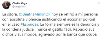 Tras la sesión, Clara Vega publicó en sus redes sociales que Mirkin “se refirió a mí persona con absoluta violencia justificando el accionar policial en el caso Espinoza”. “La forma siempre es la denuncia y la condena judicial, nunca el gatillo fácil. Repudio sus dichos y sus modos, agravado por la banca que ocupa”, denunció.