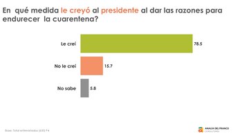 Sobre la línea argumentativa esgrimida por el mandatario para justificar la decisión de retroceder en la cuarentena, el 78,5 por ciento aseguró que “le creyó” mientras que el 15,7 descree de las razones del mandatario. “La recepción de los anuncios y sus argumentos , fue positiva a pesar de no ser “buenas noticias”. La credibilidad acerca de las razones lo fundamentó”, concluyó.