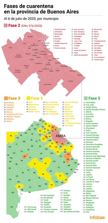 Los municipios que ya no tienen restricciones en materia de apertura comercial, profesional y actividades deportivas son los que pasaron a la fase 5. Estos son 25 de mayo, 9 de julio, Adolfo Alsina, Adolfo Gonzáles Chaves, Alberti, Arrecifes, Ayacucho, Bolívar, Bragado, Carlos Casares, Carlos Tejedor, Chacabuco, Colón, Coronel de Marian L. Rosales, Coronel Dorrego, Coronel Pringles, Coronel Suárez, Daireaux, Florentino Ameghino, General Alvarado, General Alvear, General Arenales, General Guido, General Juan Madariaga, General La Madrid, General Lavalle, General Paz, General Pinto, General Viamonte, Guamini, Junin, Laprida, La Costa, Las Flores, Leandro N. Alem, Lezama, Lincoln, Loberia, Magdalena, Maipú, Mar Chiquita, Monte Hermoso, Navarro, Patagones, Pehuajó, Pellegrini, Pergamino, Pila, Pinamar, Puán, Ramallo, Rauch y Rivadavia.