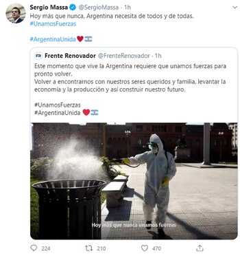 Minutos antes, Sergio Massa había publicado que “hoy más que nunca, Argentina necesita de todos y de todas”. “Estamos atravesando un momento difícil pero entre todxs estamos logrando superarlo”, sumó su esposa, la titular de AySA, Malena Galmarini.