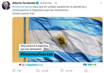 En un gesto que apunta a bajar el nivel de crispación política, el domingo por la tarde el presidente replicó uno de los mensajes de esta campaña: “Unamos Fuerzas para que en unidad superemos la pandemia y construyamos la Argentina que nos merecemos. Unidos somos más”, publicó sobre la foto de una bandera argentina.