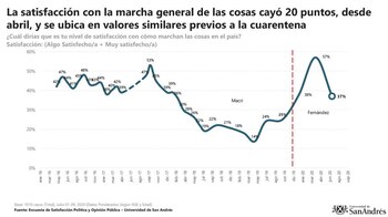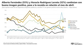 Por otro lado, la imagen del Presidente está en el 55%, todavía un alto guarismo si se toma en cuenta la dramática situación económica y sanitaria que está viviendo Argentina, pero viene de 70% que tenía en abril. En rigor, casi todos los dirigentes medidos por UdeSA cayeron en su posicionamiento, pero el que más perdió fue el jefe de Estado.