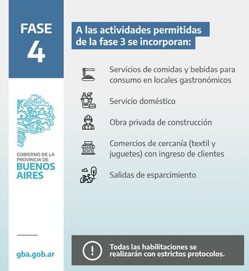 Aquellos distritos que están en Fase 4 tendrán permitido el servicio doméstico, la obra privada de construcción, comercios de cercanía, ventas de comidas, bebidas y textiles con ingreso al local y salidas de esparcimiento. “Esto es una novedad porque lo permitíamos en Fase 5 y ahora lo podrán hacer en Fase 4″, dijo Bianco.