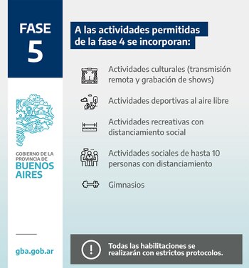“Para los que estén en Fase 5: actividades culturales (transmisión remota y grabación de shows), actividades deportivas al aire libre, actividades recreativas con distanciamiento social, actividades sociales de hasta 10 personas con distanciamiento y gimnasios”, detalló el funcionario.