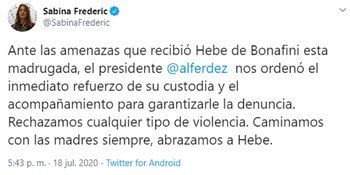 “Rechazamos cualquier tipo de violencia. Caminamos con las madres siempre, abrazamos a Hebe”, publicó la ministra en sus redes sociales.
