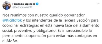 Por su parte, al término del encuentro, Fernando Espinoza expresó: “Es imprescindible la permanente cooperación para evitar más contagios en el AMBA”. “Nos ocupamos de la salud, pero también en poner en marcha el motor de la economía con una fuerte inversión en la obra pública. Continuaremos trabajando unidos para construir la Argentina de la postpandemia”, sostuvo el intendente de La Matanza. En ese sentido, Martín Insaurralde comentó que se evaluó avanzar “en la reactivación de las Pymes, industrias y comercios”.
