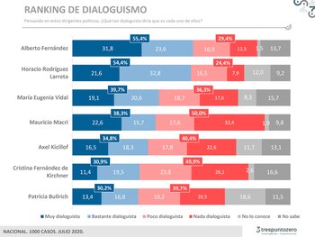 La consultora también realizó un “ranking de dialoguismo”, donde Fernández quedó al tope, con 55,4% que lo considera muy dialoguista o dialoguista. Lo sigue Rodríguez Larreta por una diferencia mínima, de un punto. En efecto, el 54,4% considera que es muy dialoguista o dialoguista.