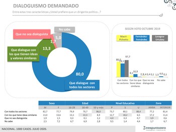 Al respecto, se destaca que el 80% considera que prefiere que un dirigente “dialogue con todos los sectores”, y solo el 13,3% eligió la opción de que “dialogue con los que tienen ideas y valores similares”. Por otro lado, el 86,7% se expresó de acuerdo con que el Presidente dialogue con Horacio Rodríguez Larreta y el 61% con Mauricio Macri.