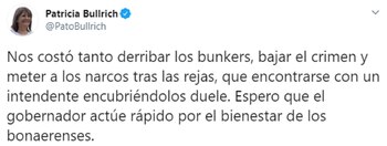 “Nos costó tanto derribar los bunkers, bajar el crimen y meter a los narcos tras las rejas, que encontrarse con un intendente encubriéndolos duele”, planteó la presidenta del PRO, Patricia Bullrich a través de las redes sociales.