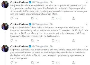 Este miércoles, la Cámara Federal limitó una orden de la jueza María Servini para analizar las llamadas telefónicas del ex presidente Mauricio Macri y un grupo de funcionarios. El fallo generó la reacción de Cristina Kirchner, que criticó duramente a la Justicia a través de una serie de publicaciones en su cuenta de Twitter, en medio de la cuestionada reforma judicial que intenta impulsar el actual Gobierno.
