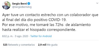 “Ayer tuve un contacto estrecho con un colaborador que al final del día dio positivo COVID-19. Por ese motivo, me tomaré las 72 horas de aislamiento hasta realizar el hisopado correspondiente”, había publicado el pasado 9 de agosto en la red social Twitter.