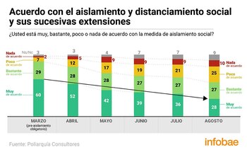 Al ser consultados específicamente sobre la cuarentena, en marzo un 60% dijo estar “muy de acuerdo” y un 29%, “de acuerdo”. Para agosto, ambas categorías cayeron al 28% y al 27%, respectivamente.