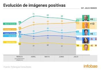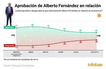 No obstante, a pesar de estar 6 puntos arriba, uno de los datos más significativos es que en abril, durante las primeras semanas de aislamiento obligatorio, su imagen positiva alcanzó un pico del 71% que luego comenzó a descender progresivamente a la par del cansancio social con las medidas restrictivas.