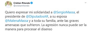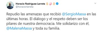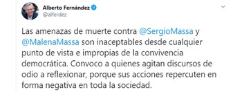 “Las amenazas de muerte contra Sergio Massa y Malena Massa son inaceptables desde cualquier punto de vista e impropias de la convivencia democrática. Convoco a quienes agitan discursos de odio a reflexionar, porque sus acciones repercuten en forma negativa en toda la sociedad”, señaló el presidente Alberto Fernández a través de las redes sociales.