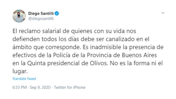 El vicejefe de Gobierno porteño, Diego Santilli, fue otro dirigente que se expresó por lo sucedido: “El reclamo salarial de quienes con su vida nos defienden todos los días debe ser canalizado en el ámbito que corresponde. Es inadmisible la presencia de efectivos de la Policía de la Provincia de Buenos Aires en la Quinta presidencial de Olivos. No es la forma ni el lugar”.