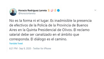 El jefe de Gobierno porteño, Horacio Rodríguez Larreta, también se manifestó en sintonía: “No es la forma ni el lugar. Es inadmisible la presencia de efectivos de la Policía de la Provincia de Buenos Aires en la Quinta presidencial de Olivos. El reclamo salarial debe ser canalizado en el ámbito que corresponda. El diálogo es el camino”.