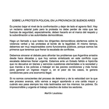 Por su parte, Martín Lousteau emitió un comunicado pidiendo “bajar el nivel de la confrontación y el agravio fácil” y dijo que la protesta policial debe hacerse “en el marco del respeto y la subordinación a las autoridades democráticas”.