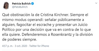 Una de las primeras en manifestarse públicamente fue la presidenta del PRO, Patricia Bullrich, quien a través de las redes sociales lamentó la “obstinación” de Cristina Kirchner. “Siempre el mismo modus operandi: señalar públicamente a alguien, fagocitar el escrache y presentar un Juicio Político por una decisión que va en contra de lo que ella quiere. Defenderemos a Rosenkrantz y la división de poderes siempre”, publicó la ex ministra de Seguridad.