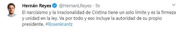 Hernán Reyes, diputado porteño por la CC, señaló que “el narcisismo y la irracionalidad de Cristina tiene un solo límite y es firmeza y unidad en la ley”. También dijo que la vicepresidenta “va por todo y eso incluye la autoridad de su propio presidente”.