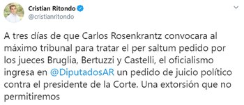 En la misma línea, el jefe del bloque del PRO en Diputados, Cristian Ritondo, adelantó: “A tres días de que Carlos Rosenkrantz convocara al máximo tribunal para tratar el per saltum pedido por los jueces Bruglia, Bertuzzi y Castelli, el oficialismo ingresa en Diputados un pedido de juicio político contra el presidente de la Corte. Una extorsión que no permitiremos”.