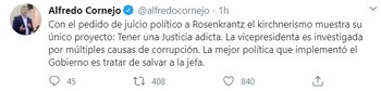 “Nada nuevo bajo el sol. Ahora es el turno de la corte, juicio político a Rosenkrantz. Impunidad y revancha. Otra embestida K a la justicia Argentina”, sintetizó el jefe del interbloque de Juntos por el Cambio en el Senado, Luis Naidenoff.