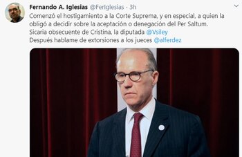“Comenzó el hostigamiento a la Corte Suprema, y en especial, a quien la obligó a decidir sobre la aceptación o denegación del Per Saltum. Después hablame de extorsiones a los jueces Alberto Fernánez”, ironizó.