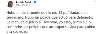 A través de las redes sociales, la ex funcionaria y actual presidenta del PRO, defendió el protocolo Chocobar, al recordar que el caso. “Hubo un delincuente que le dio 11 puñaladas a un ciudadano. Hubo un policía que actuó para detenerlo. Se reanuda el juicio a Chocobar, yo estoy junto a él y con todos los policías que arriesgan su vida para cuidar a la sociedad”, afirmó.