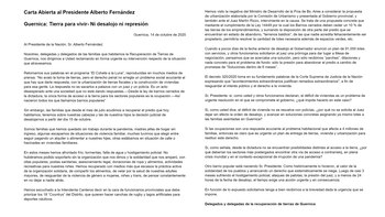 En otro de los párrafos los delegados y delegadas de la usurpación de Guernica escribieron: “Sr. Presidente: si, como usted y otros funcionarios declaran, el déficit de viviendas es un problema de urgente resolución en el que se compromete el Gobierno, ¿qué impide hacerlo en este caso?” y le cuestionan: "Si, como usted dice, el déficit de vivienda no se resuelve con policías, ¿por qué no se solicita al Juez dejar sin efecto la orden de desalojo, y avanzar en soluciones concretas asignando ya mismo lotes a las familias asentadas en Guernica?