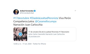 El jefe de Gabinete, Santiago Cafiero, acompañó su mensaje con un video y pidió sumarse al festejo virtual. “Subí el volumen y cantá la marcha. Ayer, hoy y siempre, un grito de corazón: ¡viva Perón! Celebremos todas y todos el Día de la Lealtad”, escribió.