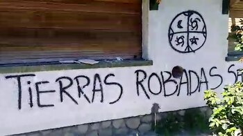 Frutos aseguró que “durante las noches siguen sacando maderas para hacer sus chozas y cabañas en la montaña” y mostró también las inscripciones que dejó la agrupación mapuche en las paredes del lugar: “Tierras robadas serán recuperadas”, sostiene uno de los grafitis.