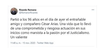 También lo despidió con un mensaje en Twitter, el ex subsecretario general de la Presidencia durante el 2° mandato de Menem, Ricardo Romano: “Partió a los 96 años en el día de ayer el entrañable amigo y compañero César Arias. Una vida que lo llevó de una comprometida y riesgosa actuación en sus inicios como marxista a la pasión por el Justicialismo. Un valiente”.