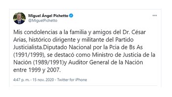 A poco de conocerse la noticia, el ex senador Miguel Ángel Pichetto, actualmente Auditor General de la Nación (cargo que ocupó Arias en el pasado), escribió un mensaje en su cuenta de Twitter: “Mis condolencias a la familia y amigos del Dr. César Arias, histórico dirigente y militante del Partido Justicialista. Diputado Nacional por la Pcia de Bs As (1991/1999), se destacó como Ministro de Justicia de la Nación (1989/1991)y Auditor General de la Nación entre 1999 y 2007.”