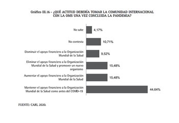 Pero frente a la crisis del multilateralismo y el comportamiento de los Estados nacionales frente a la OMS, el 46% consideró que se debe mantener el apoyo financiero como antes del COVID-19. “No parece haber otra salida que seguir apoyando y manteniendo el financiamiento de la Organización, para empoderar a la misma y a sus ramas regionales, para expandir su capacidad de reacción”, señala el estudio.