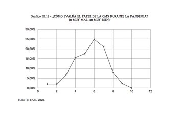 El estudio analiza el impacto que sufrió la imagen de la Organización Mundial de la Salud (OMS), cuestionada por algunos países por su falta de capacidad operativa y preventiva. Los expertos calificaron su actuación con un 6 en una escala de 1 a 10, donde 1 es muy mala y 10 muy buena.