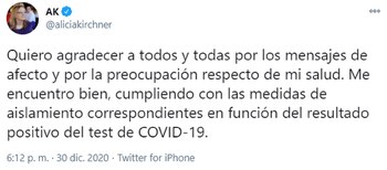 Algunas horas después de que trascendiera la noticia, Alicia Kirchner agradeció “los mensajes de afecto” y la “preocupación” por su estado de salud. “Me encuentro bien, cumpliendo con las medidas de aislamiento correspondientes en función del resultado positivo del test de COVID-19″, publicó en las redes sociales.